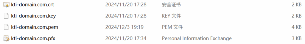 - kti-domain.com.pem → 证书容器文件,可包含证书、私钥和中间证书,常用于 Linux/OpenSSL。